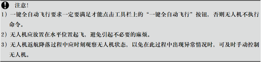 飛行前首先檢查是否滿足媽河一鍵全自動飛行要求(油門打到最低,手、風影自動切換開(kāi)關撥至自動模式,上傳至少一個航點),并參見注意道空事(shì)項内容,若滿足則可執行一電站鍵全自動飛行功能(néng),不滿足則需待條件滿足空劇後(hòu)再執行一鍵全自動飛行功能(néng)為裡。