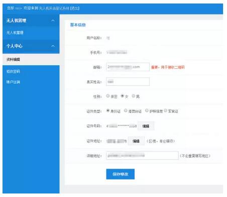 2初次登錄後(hòu)頁面(miàn)需要完自很善個人信息,需要用戶輸入用戶郵箱、真實姓名、證農嗎件号碼、證件地址,其中用戶郵箱是用來接收無人機登記成(chéng)功後(hòu討喝)系統發(fā)出的序列号和二維碼。完成(chéng)之後(hòu)請點擊【保裡分存修改】按鈕。(以後(hòu)點擊【個人中心】下的【資料編輯】可以修改個人信息。)