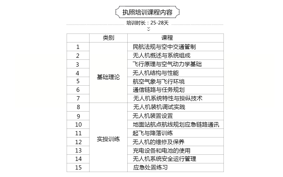 多旋翼脫産班25天;多旋翼周末班3個月(每月12日開(kāi)班,每月8号參加考試)