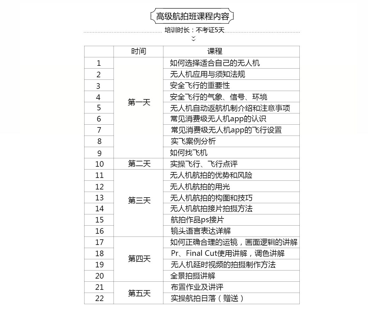 航拍課程分爲初級航拍班、中級航拍班、高級航拍班三個等級。