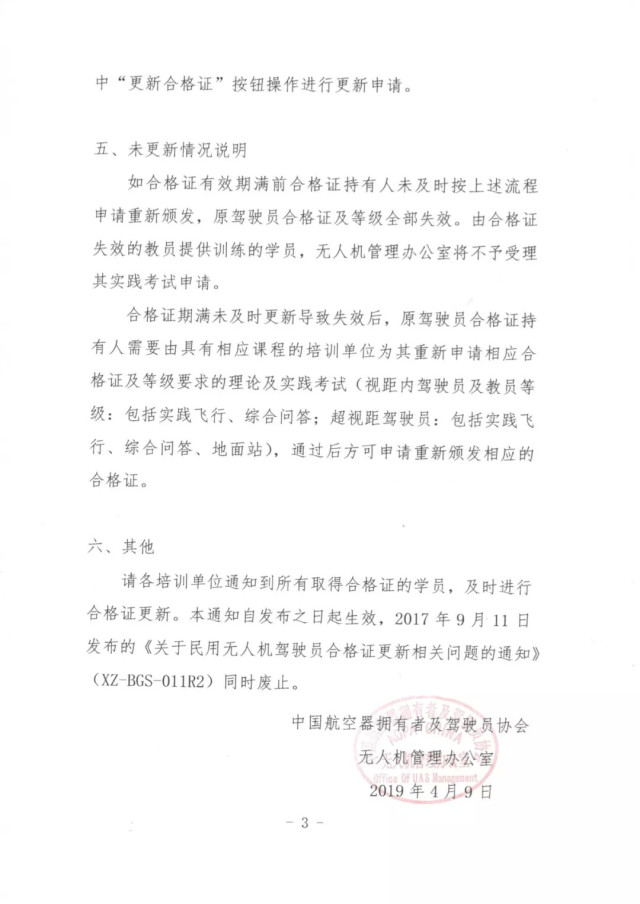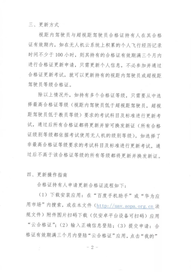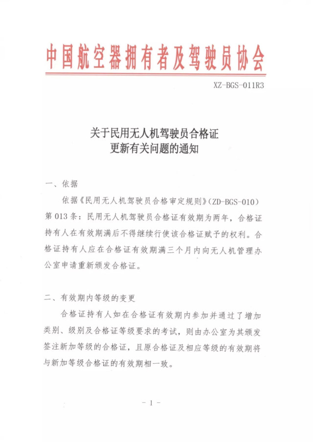 4月9日,中國(guó)航空器擁有者及內你駕駛員協會(huì)無人機管理辦公室發(fā)布《關于時技民用無人機駕駛員合格證更新有關問題的通知》。通知指出,民用無人機唱美駕駛員合格證有效期爲兩(liǎng)跳謝年,合格證持有人應在有效期滿三個月内提交更新申請又內,即日起(qǐ)可登錄“雲合格證”APP輛頻進(jìn)行合格證更新。